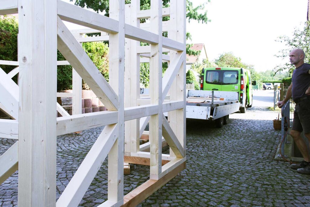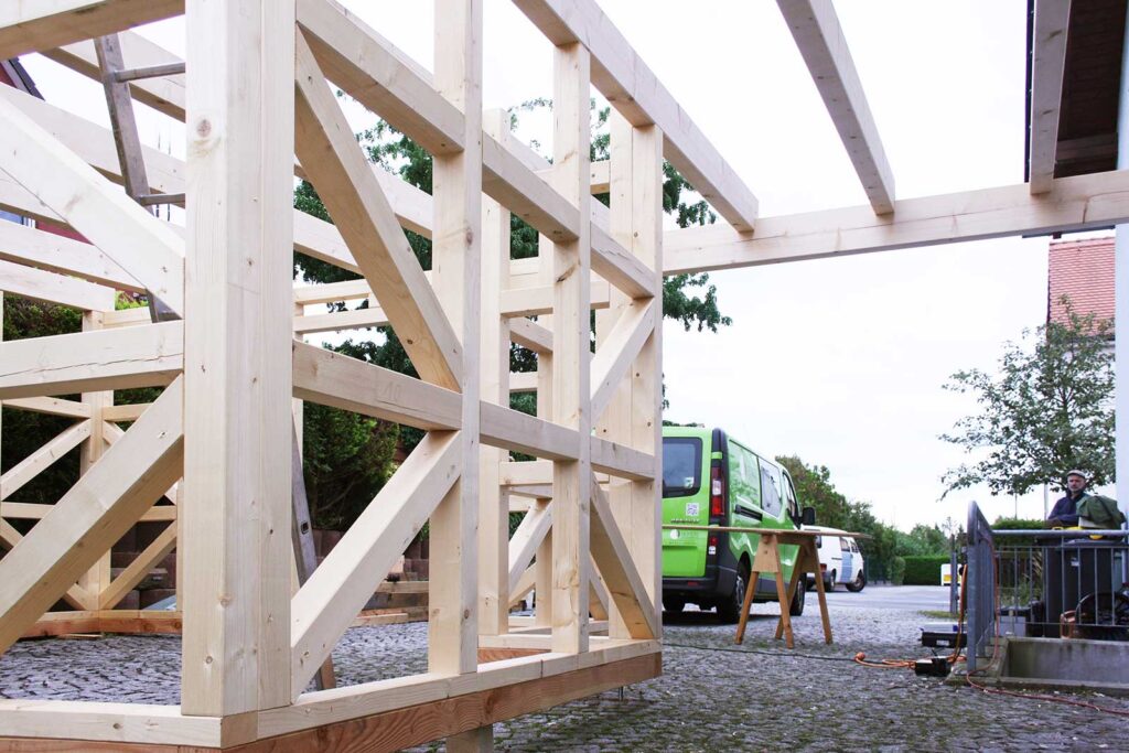 Hier sehen sie Fotos einer Baustelle in Weinböhla. Für die Fundamente des Carport wurde punktuell das vorhandene Granitsteinpflaster geöffnet und hernach sauber wieder geschlossen. Die Fundamente tragen das Schwellenholz aus Douglasie. Auf diesem steht das Rahmenwerk der Wände.