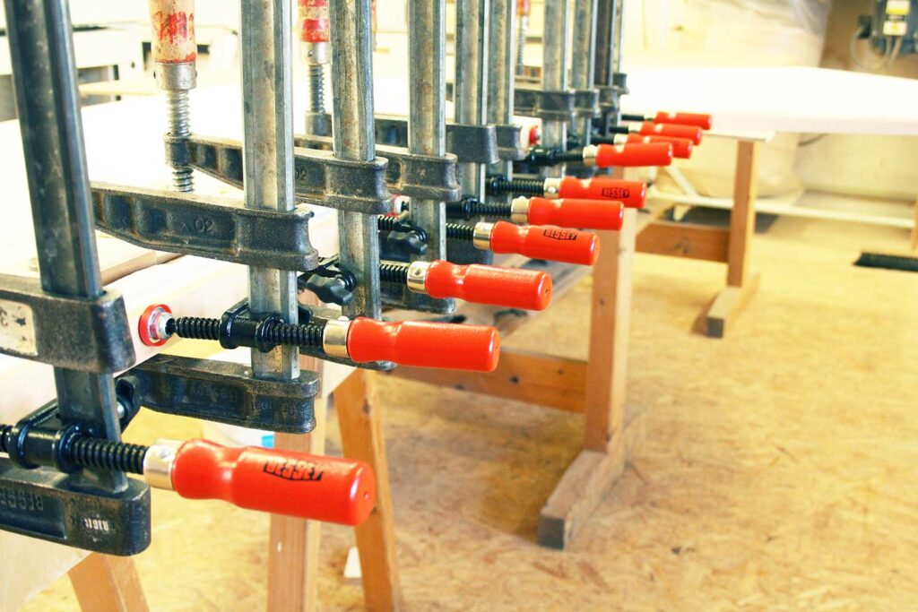 Zum Schutz der weiß beschichteten Platte ist umlaufend exakt ein Anleimer aus Massivholz Buche angeleimt. Er ist mit einem angenehmen Radius an der Kante abgerundet.