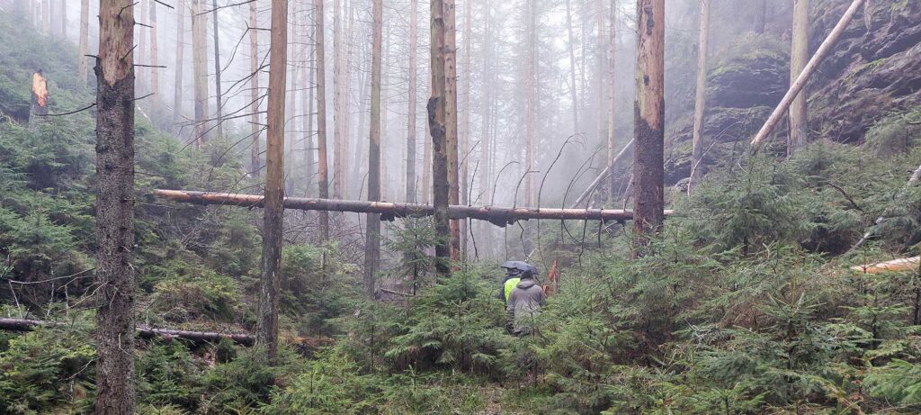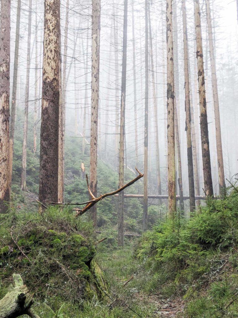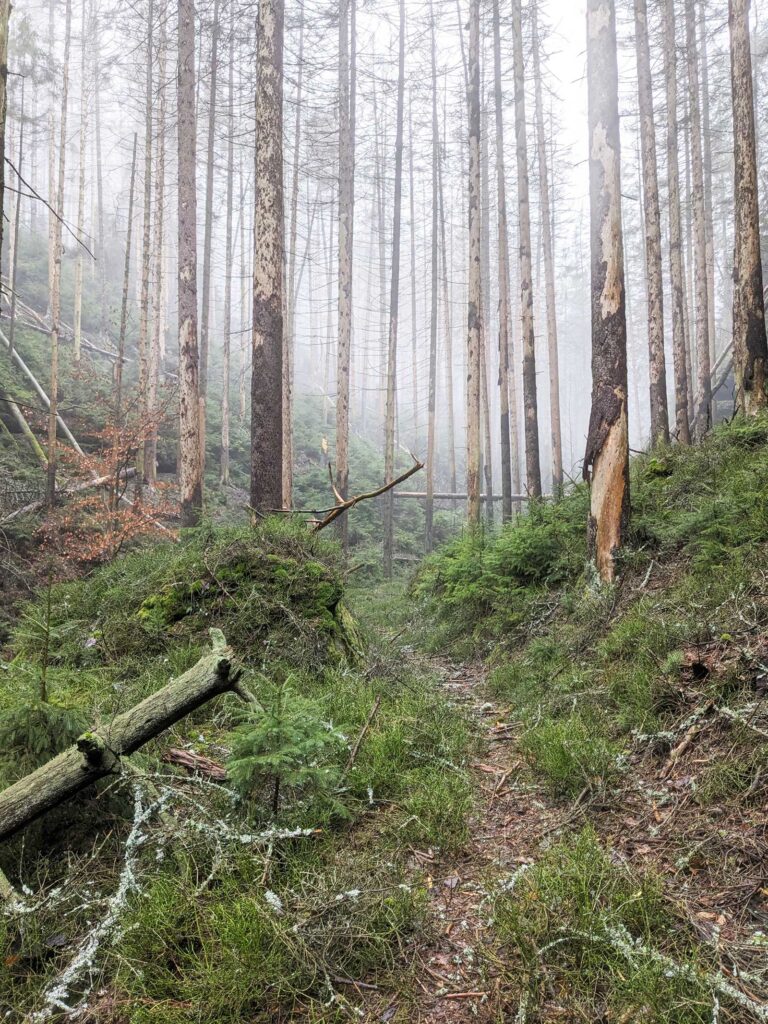Ein verregneter Wintertag in einem Tal des Nationalparks Sächsische Schweiz. Eindrucksvoll kann hier das Fichtensterben beobachtet werden. Junge Fichten wachsen bereits nach. Eine kleine Buche ist ebenfalls in der Bildmitte zu sehen. Aber auch Birken und Eichen erneuern mit ihrem Nachwuchs den Wald. Ein dauerhaftes stirb und werde.