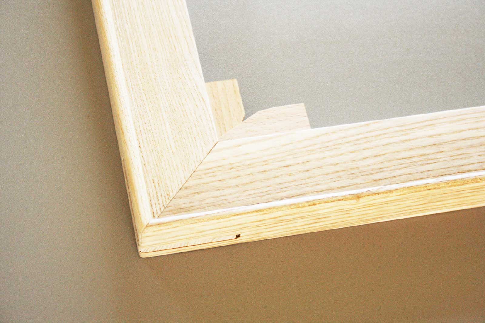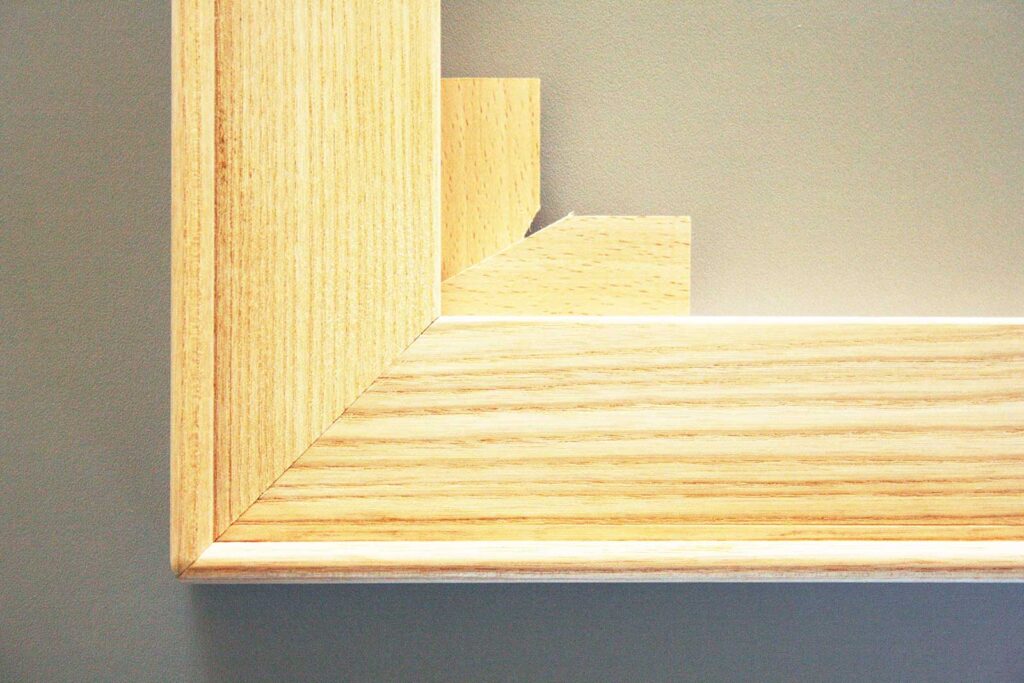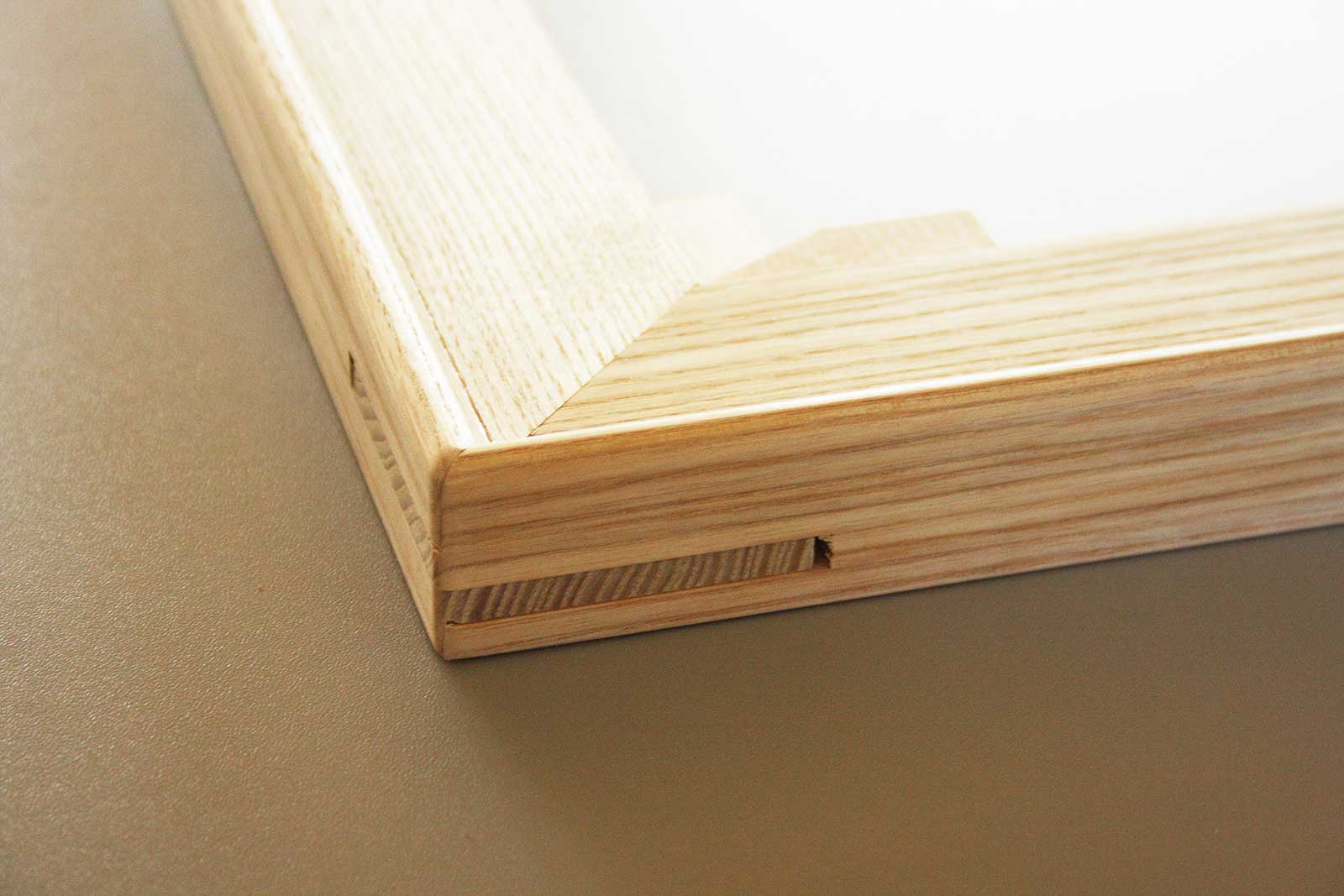 Der auf diesen Fotos dargestellte Rahmen hat einen Profilquerschnitt mit den Maßen von 54 x 32 mm. Er ist aus sehr stabilen Eschenholz gefertigt. Die Holzmaserung hat stehende Jahrringe. Diese Art Anordnung der Jahringe gewährleistet, dass sich die Rahmenhölzer bei Luftfeuchteschwankungen nicht verziehen. Ebenso trägt dazu die gute und langsame Trocknung des Holzes bei.