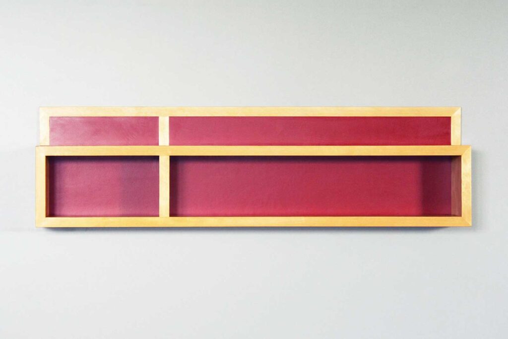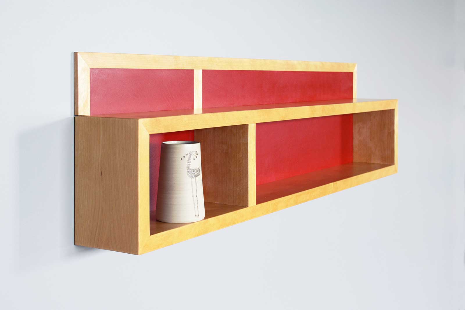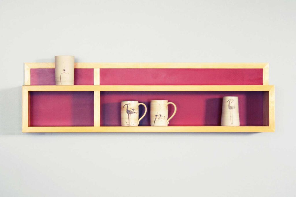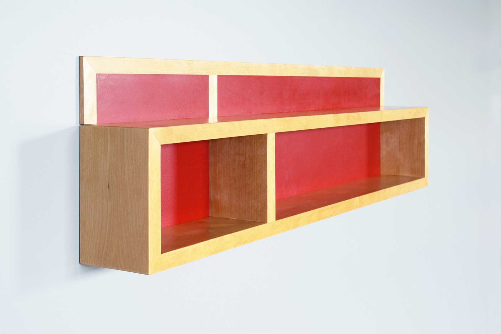 Das kleine Regal wurde aus Birke Massivholz und rotem Linoleum hergestellt. Es ist ein praktisches Wandboard und bringt zugleich Farbe in den Raum. Es können kleine Dinge wie Gewürze, Tees oder Tassen hinein gestellt werden. Dann ist immer alles griffbereit.