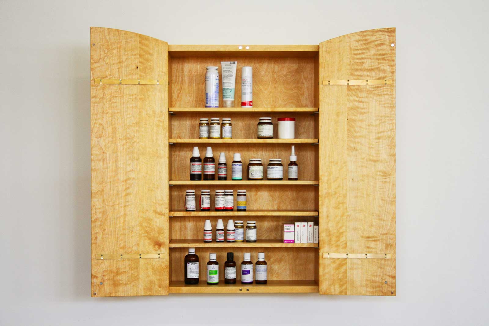 Der kleine Hausapothekenschrank aus Massivholz ist ein Hängeschrank. Er kann in Augenhöhe an der Wand montiert werden. In den niedrigen Fächern unterschiedlicher Höhe können Medikamente übersichtlich sortiert werden.