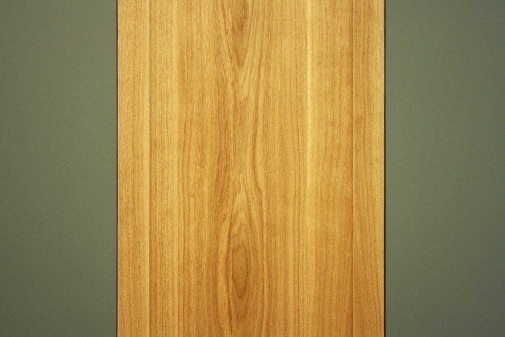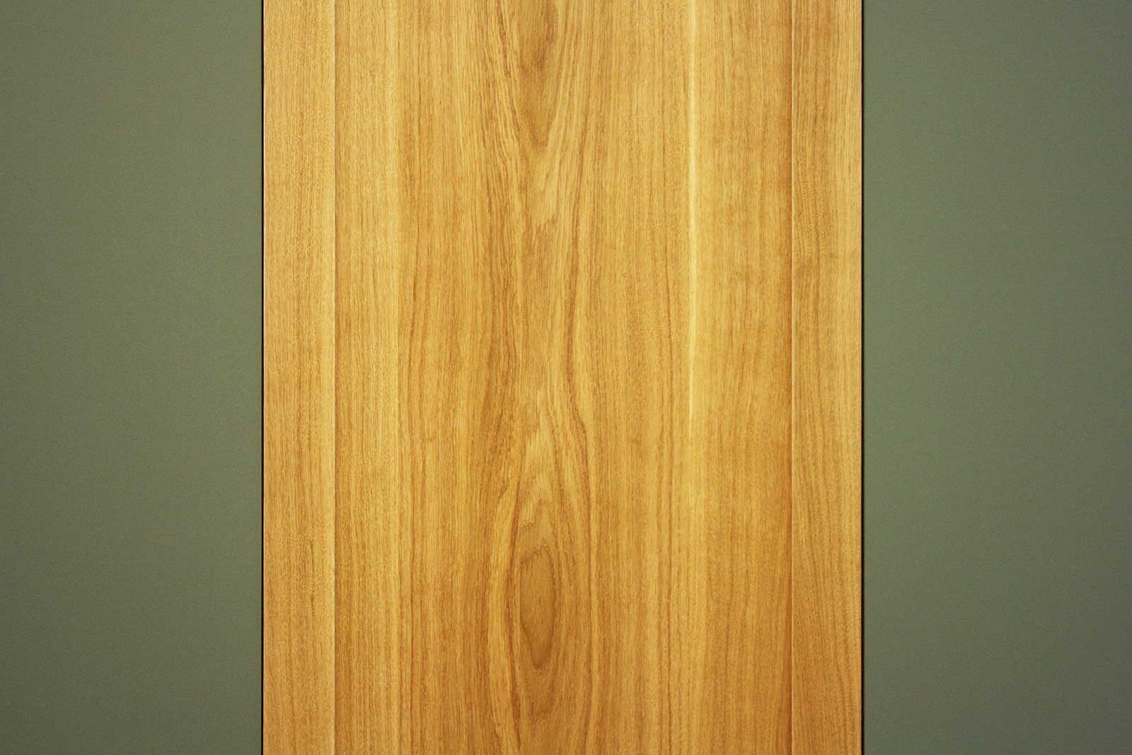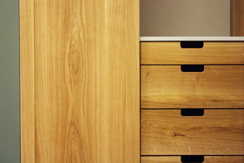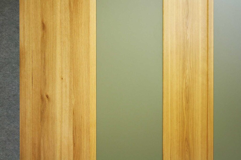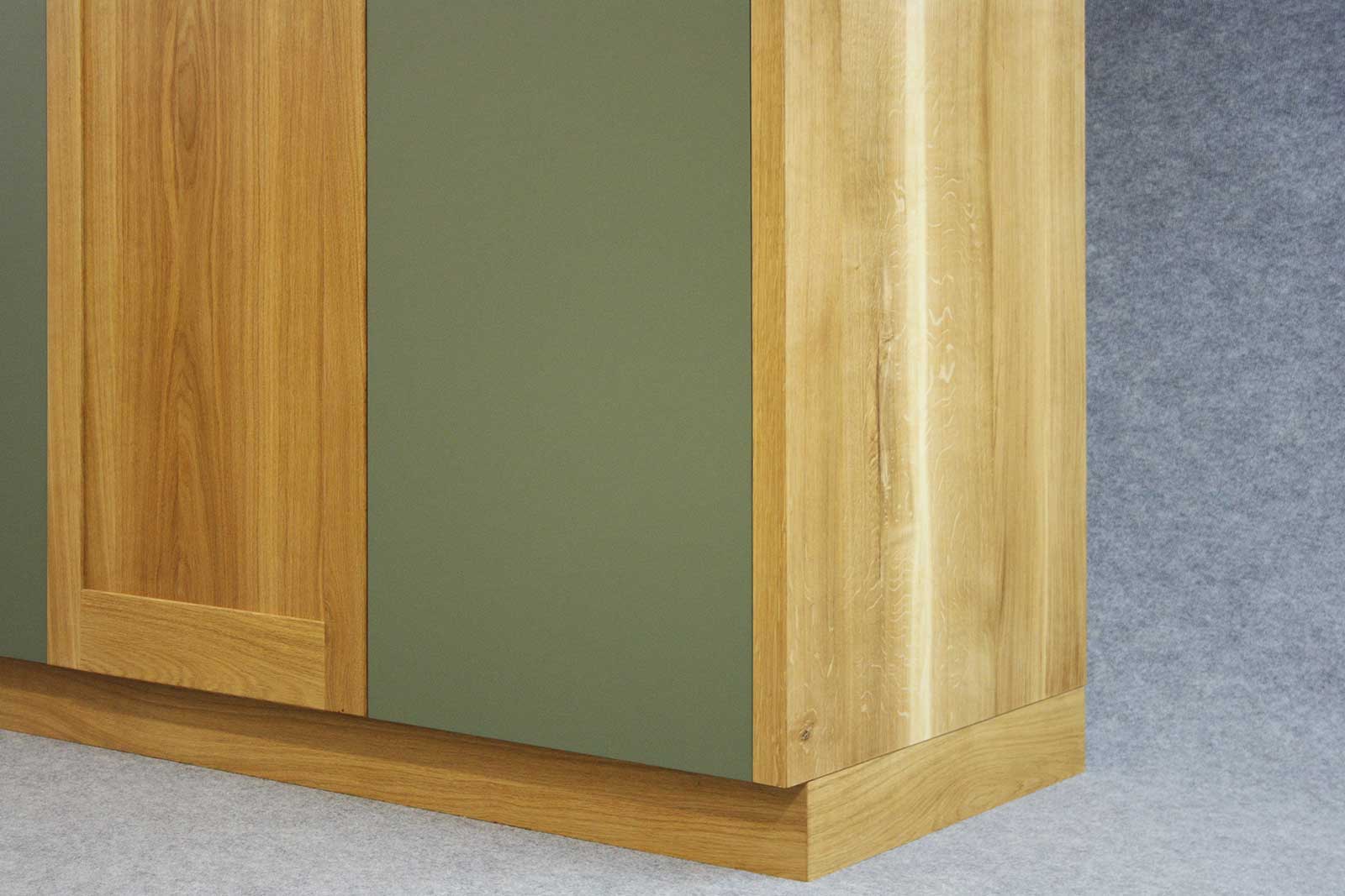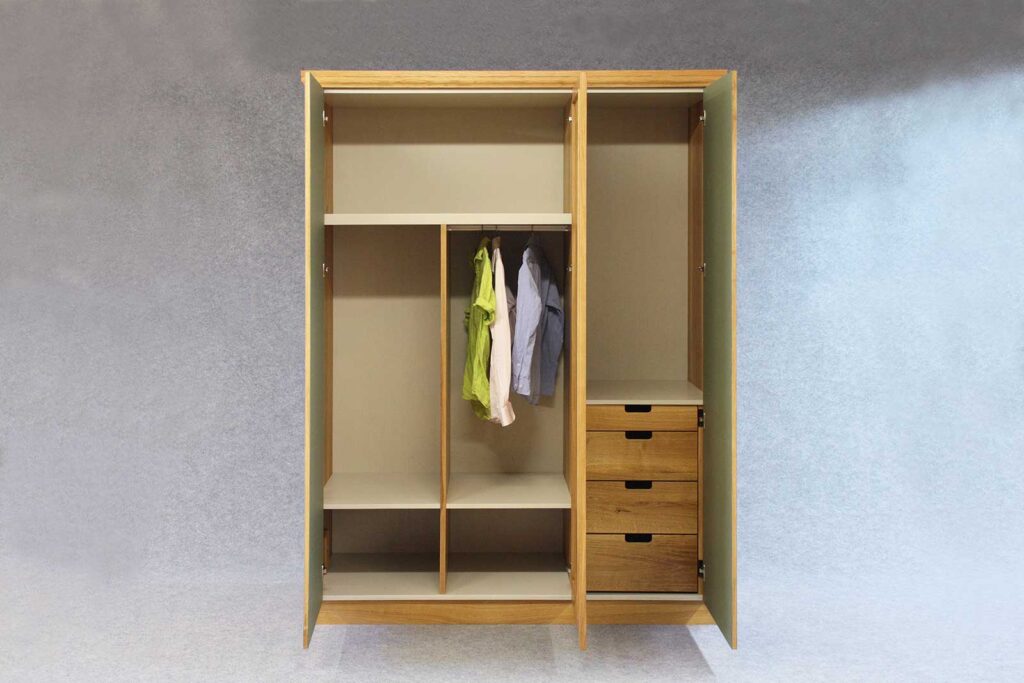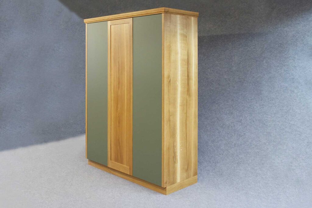 Der Massivholzschrank wurde aus Eiche hergestellt. Massivholz bedeutet, dass die Bretter aus durch und durch echtem Eichenholz bestehen. Aus diesem Holz wurden die Fronten und Seiten des Kleiderschrankes gefertigt. Wogegen die rechte und linke Türe mit dem hochwertigen, 2mm dicken Schichtstoff Linoleum belegt ist. Die olive-grüne Farbe des Möbellinoleums harmoniert mit dem Farbton des Holzes.
