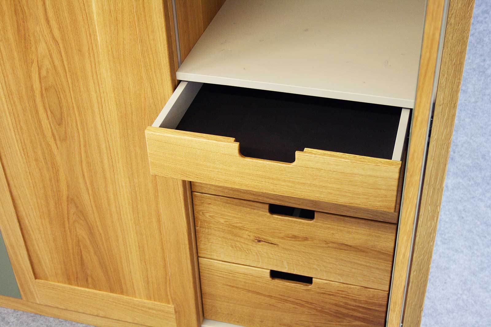 Innen ist der Kleiderschrank mit verschiedenen Fachböden, einer Kleiderstange und mit Schubfächern ausgestattet. Die Fachböben bestehen aus Fichte-Massivholz, welches grau gewachst wurde. Der Boden des oberen Schubladens ist mit echtem Leder bespannt.
