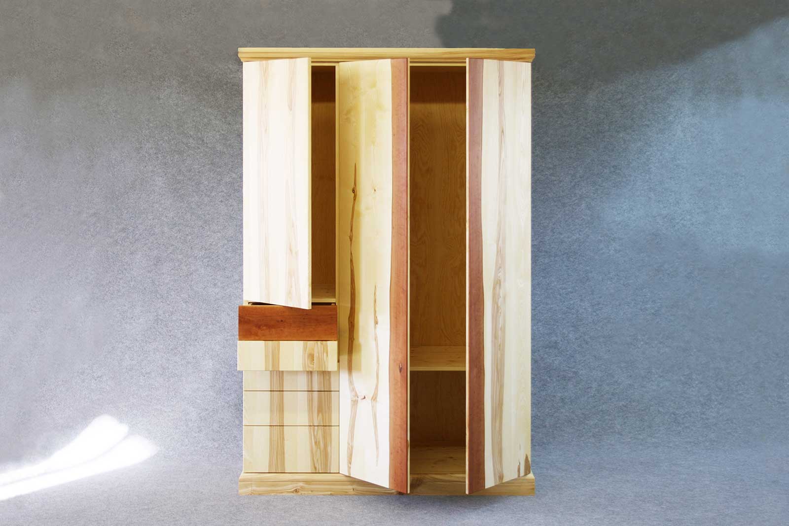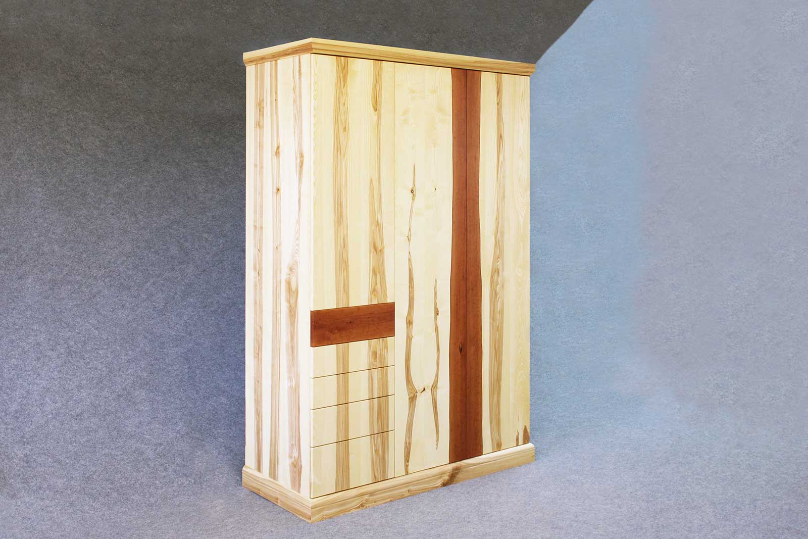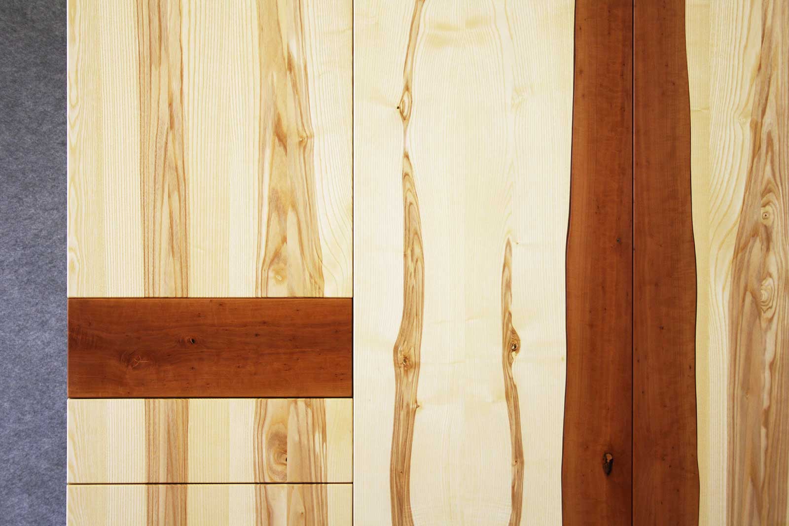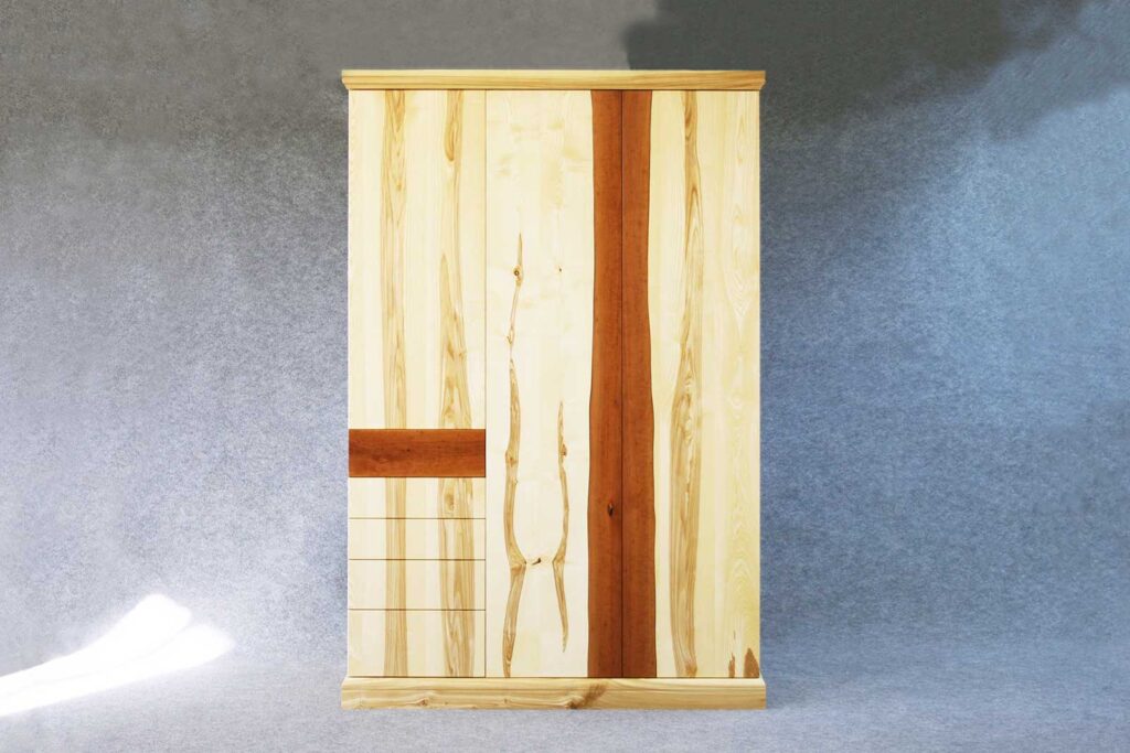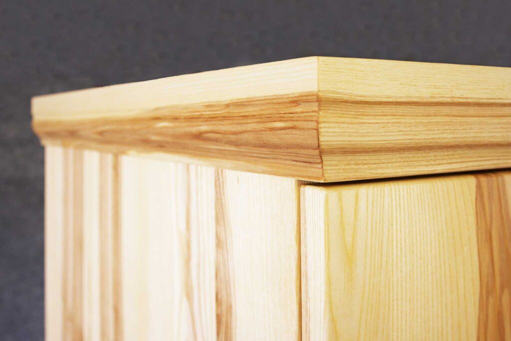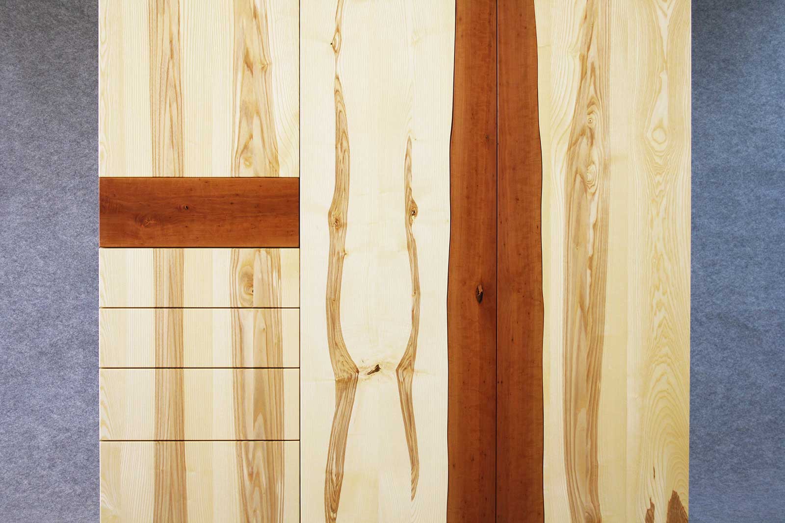 Der Massivholzschrank Paul wurde aus Eschen-Massivholz hergestellt. Die Fronten bestehen aus breiten Holzbrettern. Das helle Eschenholz weist eine dunkelbraune Verkernung auf. Diese wurde von unserem Möbeltischler bedachtsam als gestaltendes Element verwendet.