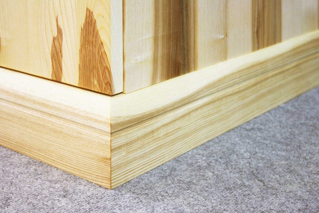 Oben und unten ist der Schrank mit dezenten Profilierungen an Sockel und Kranz versehen.