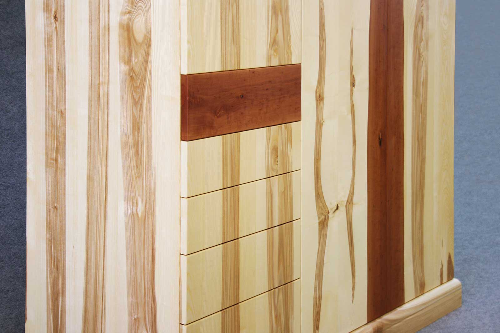 Zentraler Blickfang in der Front des Schrankes ist eine Einlegearbeit aus Birnbaumholz. Ebenso wurde eine Schubkastenfront aus Birnbaum gefertigt.