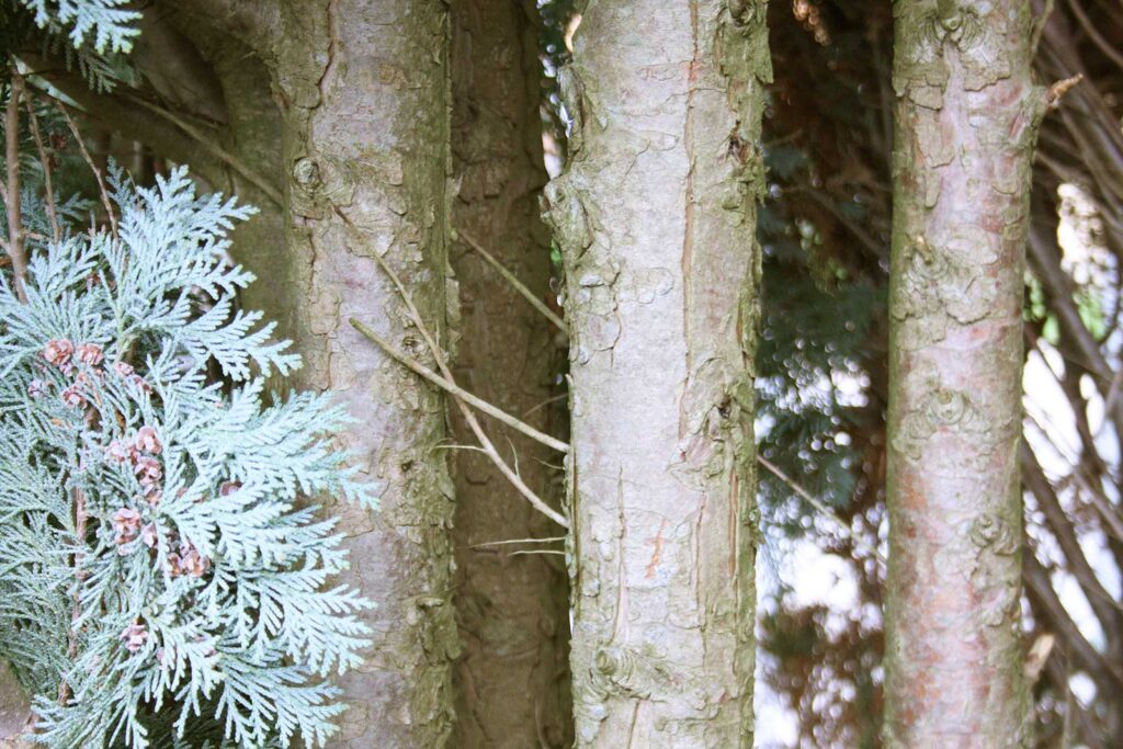 Hier sehen sie Fotos von Stamm, Rinde, Blatt und Blüte der Nutka-Scheinzypresse (Chamaecyparis nootkatensis) aus der Familie der Zypressengewächse (Cupressaceae)